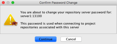 If your project is associated with a Ghidra Server that is using Ghidra password authentication, then the menu item, ProjectChange Password... will be present. Use this option when you want to change your password. A dialog is displayed to confirm your request, as shown below.
