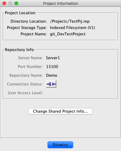 The Repository Info shows the name and port number of the Ghidra Server and the name of the repository associated with your project.