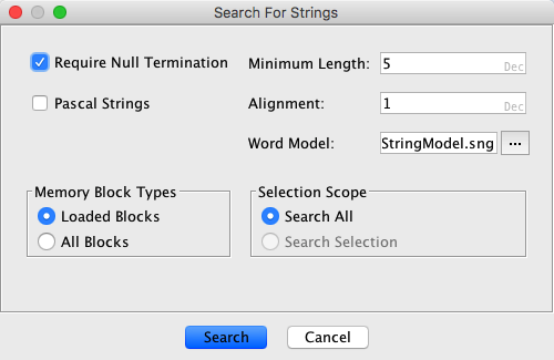 - Require Null Termination - if checked, the string resulting from the search must be null terminated. If not checked, the strings resulting from the search may or may not be null terminated.