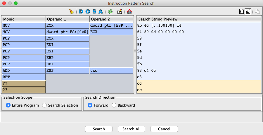 The search dialog consists of two main components: the Instruction Table and the Preview Table. The former contains all instructions selected by the user; the latter displays the string (in binary or hex) that will be used for searching