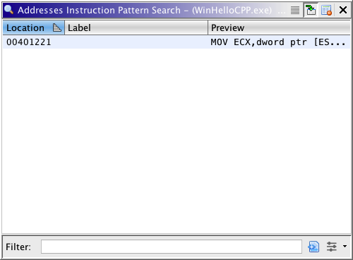 If the user clicks the Search All button, all search results will be shown in a single window, where each entry represents the starting address of a match. Clicking on an entry will take you to that spot in the listing.
