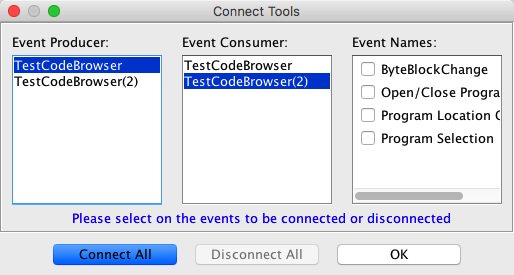 The manual connection is useful only if you want to control specific events between the tools. From the Connect Tools dialog, the easiest way to connect all tools for all events is to click on the Connect All button. This action will connect tools in both directions, just as though you had dragged and dropped the tool icons to do the automatic connection. Conversely, disconnect all tools for all events by clicking on the Disconnect All button.