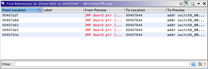 Search for Direct References will search the entire program for possible direct references to the current location or to locations within the current selection in the program. This search attempts to find the actual bytes that make up the address of the current location/selection. The search takes into account the endianness of the processor. The results are displayed in a Query Results table. The following table shows the results of searching for direct references to a location (i.e. the program doesn't have a selection). You can navigate to any resulting reference by selecting it in the table.
