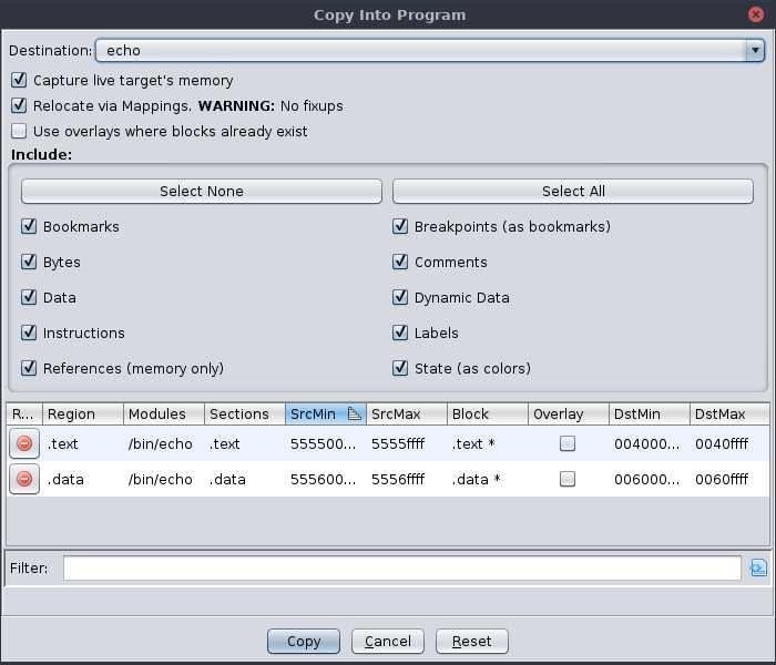 ranges to copy. For selected ranges not contained in the destination program's memory, new