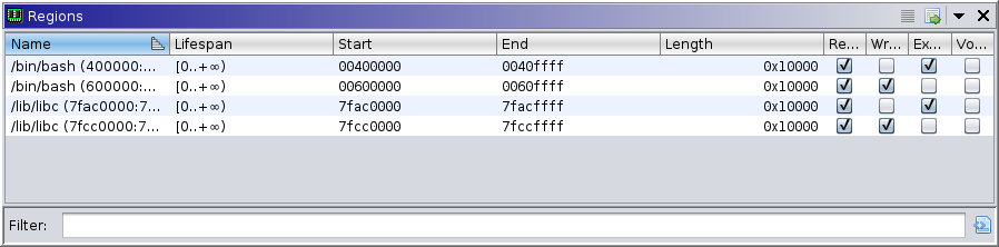 Regions refer to ranges of allocated or reserved memory reported by the target. The precise meaning of these regions may vary depending on the nature of the target. For user-mode applications, this is generally pages of memory allocated for image sections, the stack, the heap, etc. The regions manager allows the user to rename pages and modify the recorded permissions. Note that such modifications do not affect the target; but only the recording.