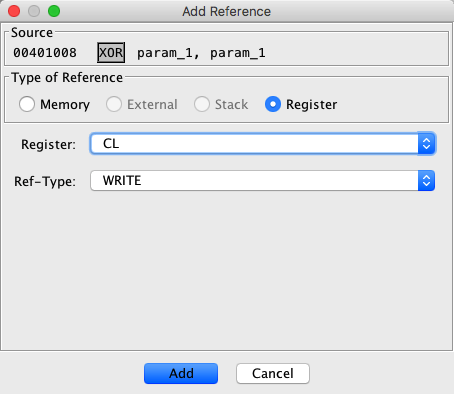 Invoking the Add... action from the References Editor window will cause the Add Reference Dialog to be displayed for the current Source code unit. Once displayed, the Source code unit mnemonic or operand may be selected by clicking on it, as well as the Type of Reference. The available choices for Type of Reference may be constrained based upon the choosen operand.