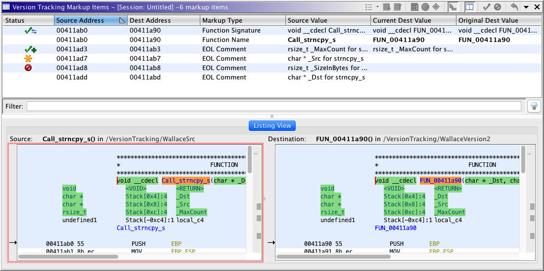 The dual listing appears below the Markup Items table when the Listing View tab is selected. It shows one listing for the source program and another listing for the destination program. When a function match is selected, each listing displays only the addresses that are part of the function. When a data match is selected, the source listing will display the addresses that make up that data and the destination listing will display the addresses that would be affected if it were applied.