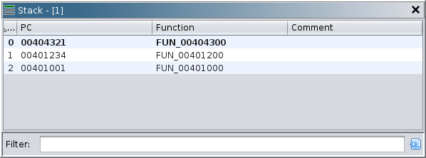 The stack window displays the current trace's execution stack, as unwound and reported by the target. Not all debuggers will unwind the stack, in which case, this window displays only the innermost frame. When emulation is used to generate the current machine state, only a single synthetic frame is shown. See the Unwind Stack action for an alternative mechanism that unwinds using Ghidra's program databases and works with emulation. Level 0 always refers to the innermost frame, and each incremental level refers to the next caller in the chain — most of the time. The current frame comprises one element of the tool's current "coordinates." Double-clicking a frame changes those coordinates, potentially causing other windows to display different information. Namely, the Registers window will show registers for the current frame, assuming they can be retrieved. The Listings may also navigate to the current frame's program counter.