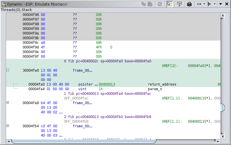 This action is in the main menu: . It attempts to unwind the current thread's stack segment, creating frame data units in the listing. It starts by reading the program counter and stack pointer from the innermost frame of the current thread. It then maps the program counter to the program database and analyzes the function containing it. If successful, it can determine the frame's base address and locate variables, saved registers, and the return address. Knowing the return address and frame depth, it can derive the program counter and stack pointer of the next frame and unwind it in the same manner. This proceeds until analysis fails or the stack segment is exhausted. For best results, ensure you have imported and opened the Ghidra program database for every module, or at least the subset you expect to see in your stack. To view the results, navigate to or follow the stack pointer in a Dynamic Listing. The Stack window does not display Ghidra's unwinding results.