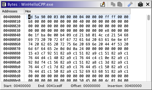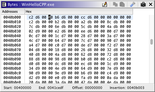 The Byte Viewer displays bytes in memory in various formats, e.g., Hex, Ascii, Octal, etc. The figure below shows the Byte Viewer plugin in a separate window from the default tool, the Code Browser.