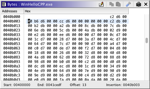 The result of setting the alignment address to 0040b003 is shown below. The calculated offset is 13, the number of bytes added to each memory block to create a new alignment. The first line of the display shows the "remainder" bytes of 16 (bytes per line) divided by 13, the offset. If you were to put your cursor on the starting byte of the first line, you would see that your insertion point is 0040b000, in this example.