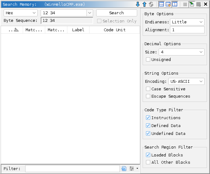 At the top of the window as shown above, there are several GUI elements for initializing and executing a memory byte search. These controls can be closed from the view after a search to give more space to view results using the