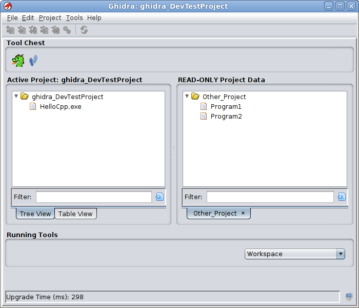 The Project Window is displayed when you run Ghidra. From this window, you manage your projects, workspaces, Programs, and tools. If you are running Ghidra for the first time, you will need to create a new project to get started.