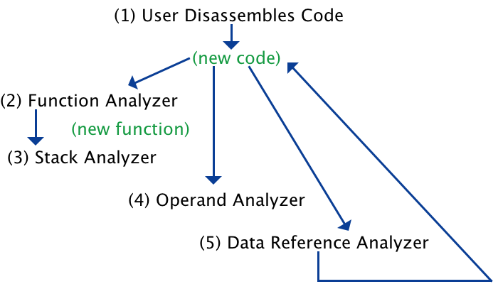 .....The cycle repeats with 2) as additional code is disassembled.One program change might cause several Analyzers to become active, however only one Analyzer is run at a time. Each Analyzer has a run priority. For instance, the Operand Analyzer will always run before the Data Reference Analyzer because the operand analyzer could create new references that the Data Reference Analyzer would need to analyze.