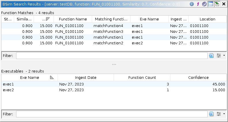 After initiating a BSim Similar functions search, a BSim Search Results Window will appear.