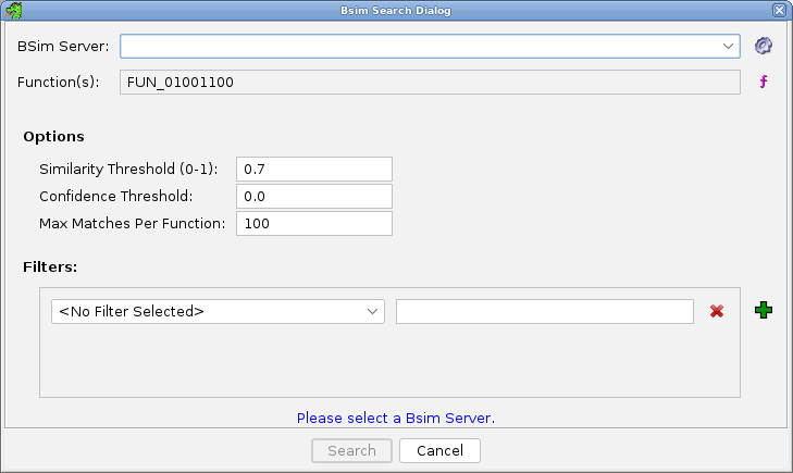 - BSim Server - Choose a BSim database/sever from the drop down list or define a new one using the