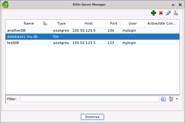 Before a BSim overview or search can be performed, one or more BSim database specifications must be defined. BSim database specifications are managed by the BSim Server Manager dialog.