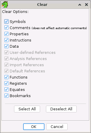 Clear With Options more selectively clears information defined in the program. While Clear Code Bytes only clears instructions and data, Clear With Options can selectively choose either instructions or data and additionally can remove other program information, e.g., symbols, references, functions, etc.