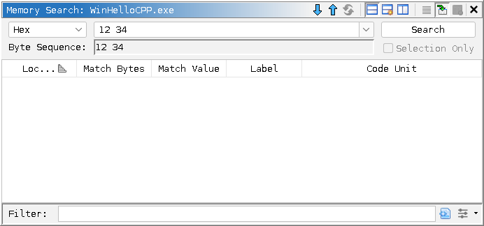 At the top of the window as shown above, there are several GUI elements for initializing and executing a memory byte search. These controls can be closed from the view after a search to give more space to view results using the toolbar button.