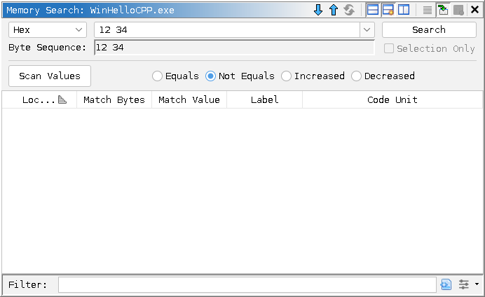 • Not Equals This option will keep all matches whose values have changed and will remove any matches whose bytes have not changed.