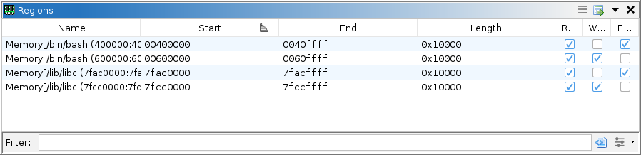 Regions refer to ranges of allocated or reserved memory reported by the target, i.e., the target's memory map. The precise meaning of these regions may vary depending on the nature of the target. For user-mode applications, this is generally pages of memory allocated for image sections, the stack, the heap, etc. The regions manager allows the user to rename pages and modify the recorded permissions. Note that such modifications do not affect the target; but only the recorded trace.