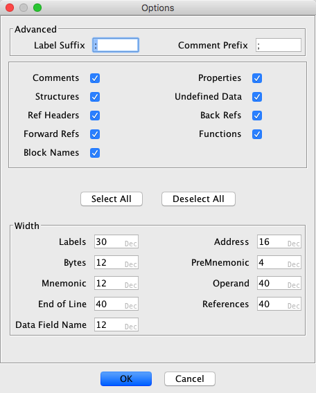 Comments Include Pre, Post, EOL, and Plate comments Properties Include properties; e.g., Bookmarks, Spacers Structures Include Structures and Unions defined on code units Undefined Data Include all undefined code units (e.g, "??") or replace with "[BYTES REMOVED]" place-holder Ref Headers Include the cross reference header BACK[m,n] or FWD[m,n]:, where m is the number of cross references and n is the number of offcut cross reference; select the Back Refs and/or Forward Refs for the Back/FWD header to show up Back Refs Include the list of cross references for each code unit Forward Refs Include the list of references to the mnemonic for each code unit Functions Include signature and header for each function Width