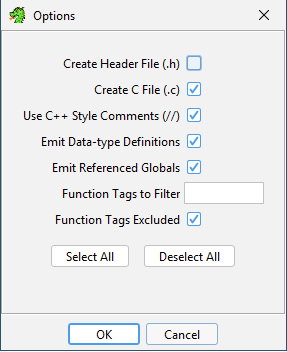 Create a C/C++ file containing functions decompiled from the program and, optionally, containing definitions of all datatypes from the program's data type manager. The datatype definitions and a prototype declaration for each function can be placed in a separate header file.