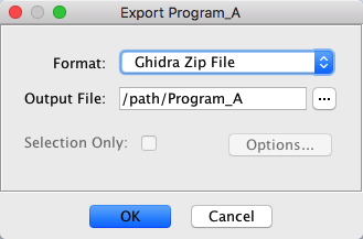 - Selection Only - If this checkbox is selected, then only the areas of the program that are in the current selection will be exported. Obviously, this only applies when exporting from an open program with a selection in the CodeBrowser tool and not when exporting from the front-end project window. Also, not all export formats support partial exports. The GZF format, for example, always exports the entire program since it is really just making an exported copy of the entire program database.