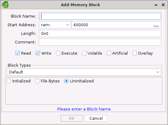 A memory block that is currently Uninitialized can be Initialized by clicking on the Initialized checkbox. A dialog will appear allowing you to enter a byte value to be used to fill the block. Deselecting the checkbox will cause the block be revert to uninitialized memory. This will have the additional side effect of removing all functions, instructions, data, and outgoing references in that block.