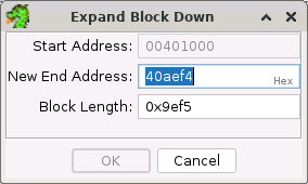 DownSelect Expand Down to bring up the Expand Block Down Dialog. The Expand Down action is enabled when exactly one memory block is selected. Use the Expand Block Down Dialog to cause a memory block to grow by adding additional bytes AFTER the memory block. The block can be expanded by either entering a new end address or a new length.