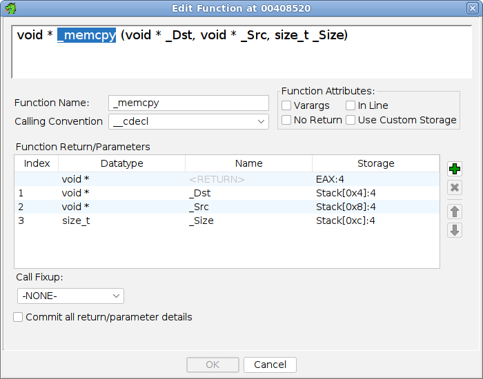 This checkbox controls whether a complete function update will be performed, including datatype and optional custom-storage details, for the return and all parameters. This checkbox will enable itself when specific changes are made which require a complete commit in order to preserve what is seen in the editor. Use of custom storage or altering return or parameter datatypes will require a full commit in order to retain such changes. It is important to note that a full Commit with storage and/or datatype changes will impose a USER_DEFINED Signature Source which will lock-in parameter details within the Decompiler. The Signature Source Function Listing Field can be useful for monitoring this state.