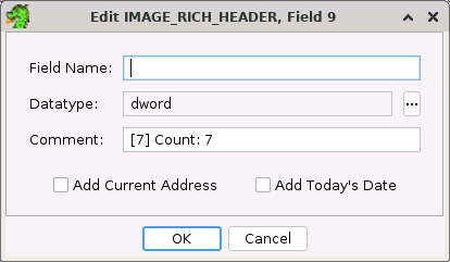 As a convenience, a structure or union field can be edited directly from the listing without bringing up the entire structure or union editor. To edit a field, click anywhere on the line displaying that field in the listing and then right click and select Data Edit Field... from the popup context menu.