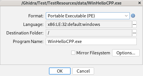- Mirror Filesystem - If checked, the filesystem path layout of any imported binaries will be mirrored in the destination folder. Any filesystem directory and file soft links will be mirrored as Ghidra project folder and file links..