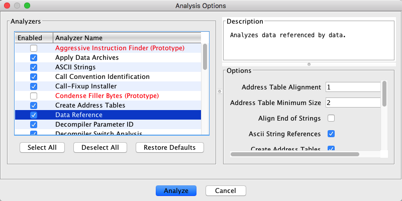 .....The cycle repeats with 2) as additional code is disassembled.One program change might cause several Analyzers to become active, however only one Analyzer is run at a time. Each Analyzer has a run priority. For instance, the Operand Analyzer will always run before the Data Reference Analyzer because the operand analyzer could create new references that the Data Reference Analyzer would need to analyze.