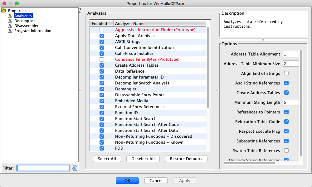 The Windows x86 PE Analyzers analyze a Windows PE program for MS Visual Studio data structures and code. They currently attempt to identify RTTI structures, virtual function tables, and exception handling code. One also analyzes the external functions and attempts to propagate the data types associated with the parameters.