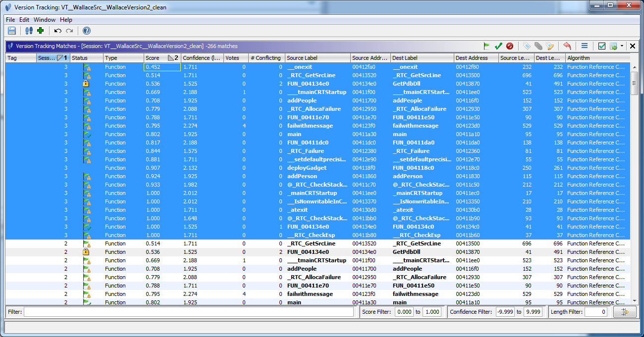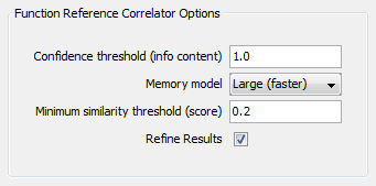 1. By first running the "Exact Function Instructions Match" correlator, and then running the "Function Reference Correlator" with the default options as above, we see potential matches with Scores >= 0.5.