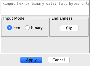 button, the manual entry dialog above will be displayed. Users may enter either a binary or hex string here (full bytes, no nibbles!) and if the string represents a valid set of instructions for the loaded program, then activating the Apply button will cause them to be displayed in the Instruction Table.
