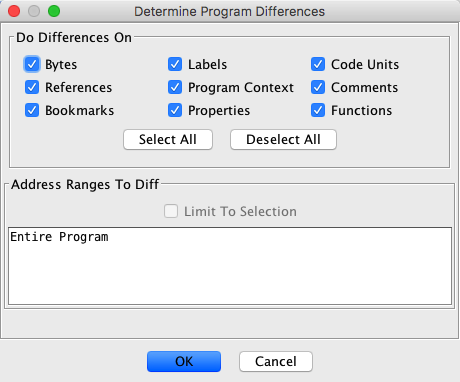 Do Differences On : the types of differences to be determined and highlighted by the Program Diff. The Select All button is a convenience for selecting all of the check boxes for difference types. Likewise, the Deselect All button removes the check marks from all the difference type check boxes.