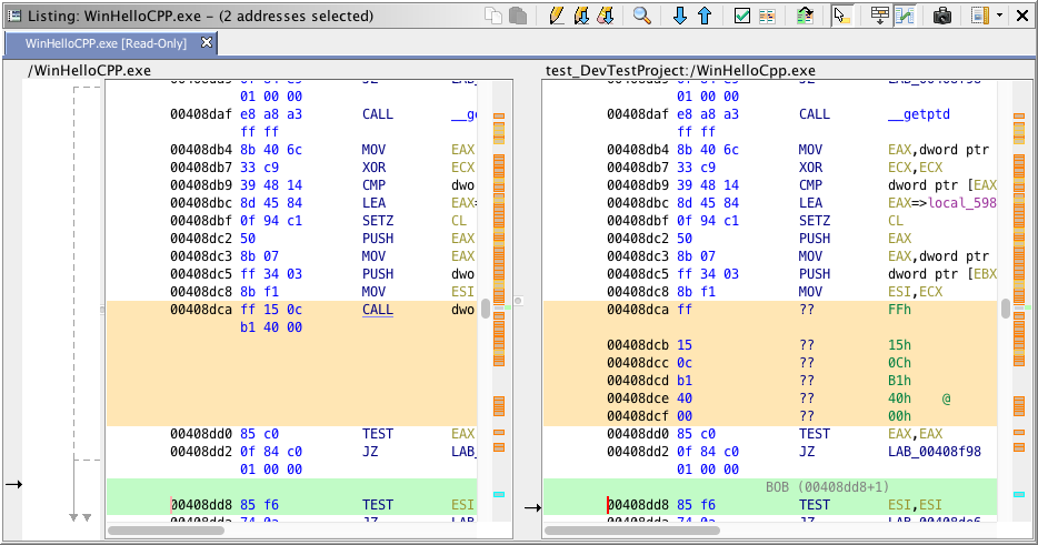 The tool's program, that will be modified by the Diff, is displayed on the left-hand-side of the Code Browser. The second program, where the differences to apply are obtained, is displayed on the right-hand-side. Markers in the right margin of the second program give an indication of all the positions in the current view where there are differences between the two programs. The view of both programs is still controlled by the program tree for the tool's program. In other words, the second program's view will only show addresses that match those viewed for the tool's program.