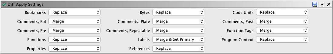 This applies the selected differences and navigates to the next difference in a single step (see Apply and Next). It can also control whether some types of differences replace what is in the tool's program or whether they are merged into the tool's program. Only the highlighted code units in the second program, which are currently selected, can have their differences applied.