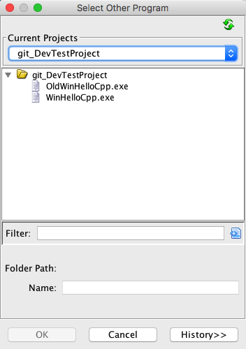 If you wish to Diff against a previous version of a versioned program, select the History>> button of a program. Select the versioned program from the tree. Next select the desired version of the program from the history list on the right side of the dialog.