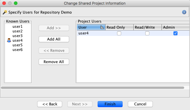 icon. To add users, select users from Known Users, select the Add>> button. Add all users by selecting the Add All button. To remove users, select users in the project, and select the <<Remove button. To remove all users (except yourself), select the Remove All button. The Project Users table on the right side of the dialog indicates user privileges.