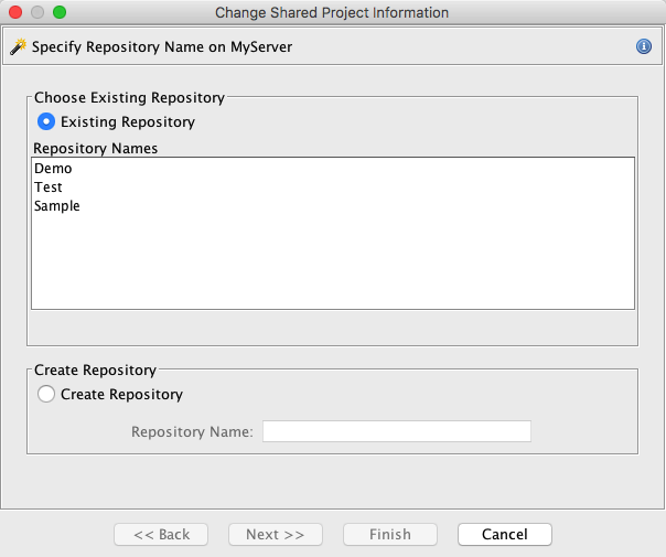 Once connected to the specified server and port, the Change Shared Project Information wizard displays repository information. By default, the Existing Repository radio button is selected because of the existing repositories found on the server.