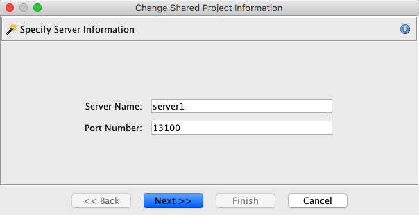 - The Change Shared Project Information wizard displays the project's current server name and port number. If desired, use this panel to change the server name and/or port number.