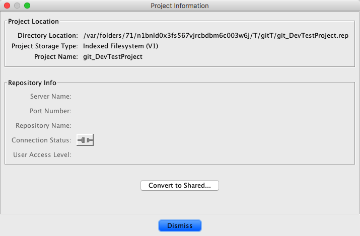 The image below shows project information for a project that is not shared. Note that the repository information is disabled. Before you can convert your project, you must first close any files that you have opened, and check in any files that you have checked out.
