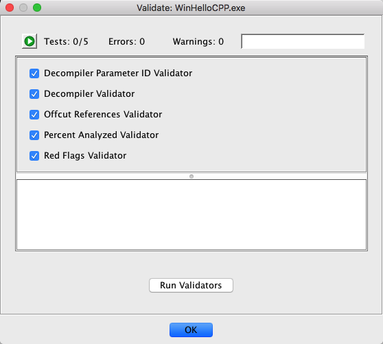 Once you press the Run Validators button, each selected validator will run in the order presented in the window. As they run, each will display its progress and then an icon which represents the results of the validator. This progress is displayed using a normal Ghidra task monitor and each validator can be aborted individually by pressing its stop Stop button.
