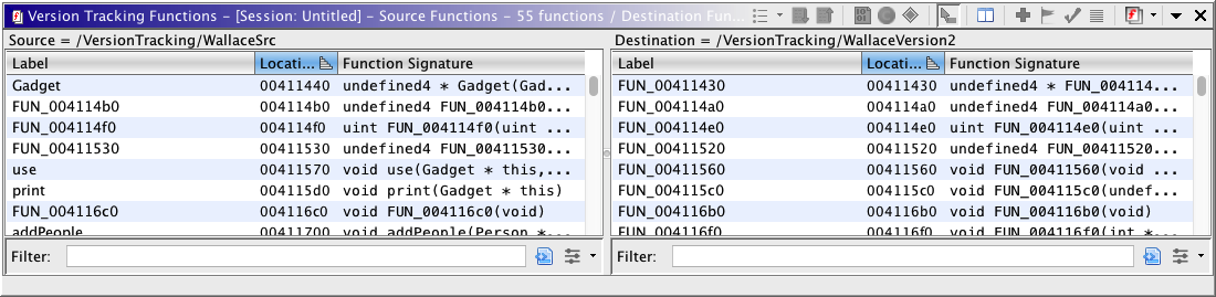 The functions table shows a list of all functions in the source program and the destination program. You can filter this table to show only those functions that are not part of a match. This is useful if you would like to create a manual match from two functions.