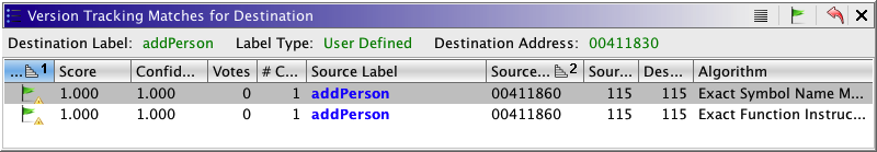 The table itself contains a row for each of the matches (if any) for the current function or data. Each table row shows the name and address of each possible match in the Destination Tool, along with other match information. In this case, correlators have found more than one potential match to the current function in the Source Tool. These matches might be entirely different functions or the same function but found with different correlators. In this example, the user decided that "addPerson" in the source program matched function addPerson in the destination program. It has already been accepted by the user as the correct match. Therefore both rows that indicate a match to the same destination function are marked accepted. By definition, there can only be one accepted match per function.