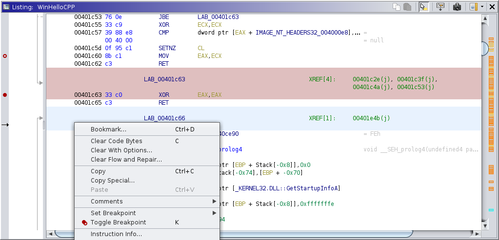 For a description of how breakpoints are managed logically in Ghidra, please read about the Breakpoints window. Each individual breakpoint location is placed in its respective listing. By default, disabled breakpoints are not readily visible in the dynamic listing. Breakpoints are best controlled using the static program listing, where they are stored as bookmarks. When this plugin is active, additional actions are available for managing those bookmarks and their mapped breakpoints on target, when applicable. The actions in the listing manipulate the logical breakpoint as a whole, not just the individual location. Furthermore, depending on the target, locations' states may be bound to others' via a common breakpoint specification.