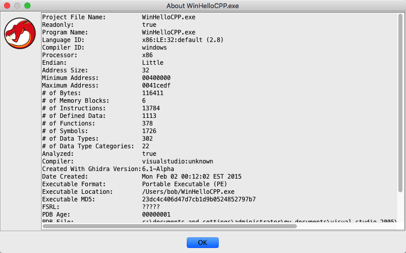 Notes: When viewing the "About" information on a non-open program, you may get a very abbreviated version of the program's information if the program was created with a version of Ghidra before version 4.2. Once a program has been saved with version 4.2 or later, the full "About" information will be available.